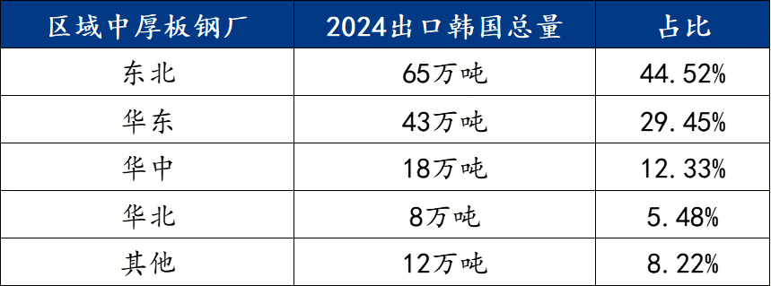 据调研,2024年向韩国出口中厚板的国内钢厂主要有10家企业,按出口总量计算,东北区域占比最大,达到44.52%,且较为集中。其次是华东地区钢企,占比接近30%,但较为分散。