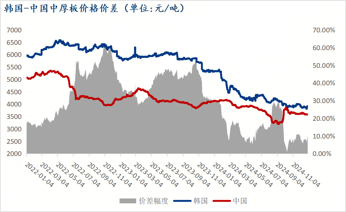 事件起因:2022年起,韩国与中国中厚板价格从800元/吨价差,一路飙升至2400元/吨左右,导致韩国造船业、建筑业难以承受高昂的生产成本及大量的订单流失,迫使韩国造船企业选择大量进口中国的造船板,并以此倒逼韩国钢企降价。
