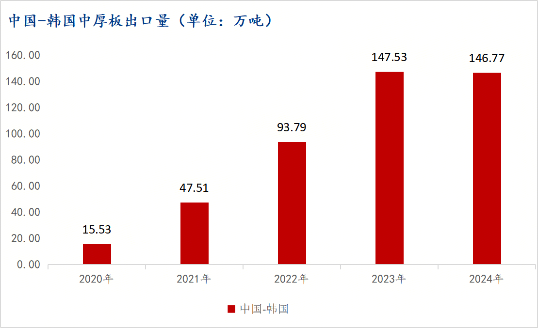 据海关数据显示,自2021年开始,中国向韩国出口的中厚板量激增,截止到2024年,已连续两年接近150万吨/年的水平,占中国中厚板出口总量的15%。