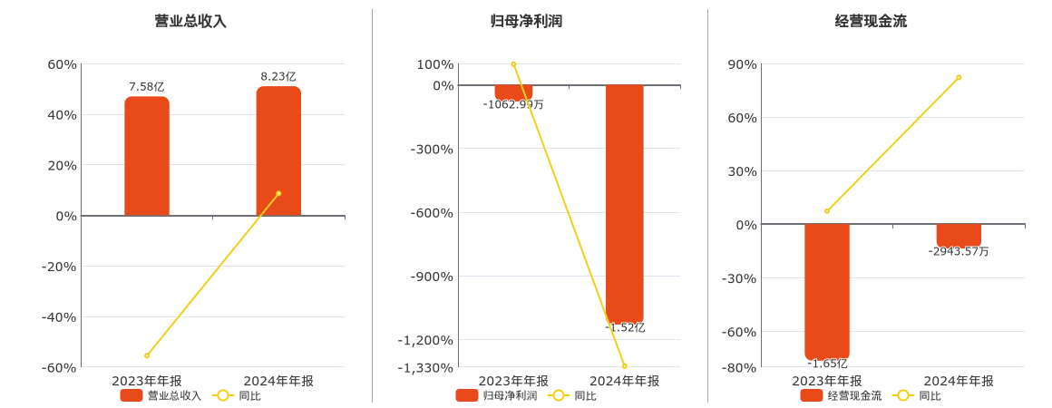 公司营业总收入为8.23亿元,在已披露的同业公司中排名第40。归母净利润为-1.52亿元,在已披露的同业公司中排名第47,较去年同报告期归母净利润减少1.41亿元。经营活动现金净流入为-2943.57万元,在已披露的同业公司中排名第53。